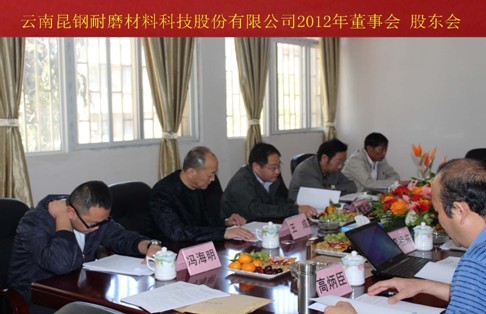 2012年3月24日,云南昆鋼耐磨材料科技股份有限公司首屆董事會第七次會議、股東會第五次會議在黑林鋪前街59號團鋼廠院內(nèi)(原團鋼子弟小學)3樓會議室勝利召開。會議由董事長李亞鵬召集和主持,云南昆鋼重型裝備制造集團有限公司董事長兼總經(jīng)理黃開萬、昆明新云欽耐磨材料總廠董事長馮煥欽、昆明理工大學材料科學與工程學院院長蔣業(yè)華等董事及云南昆鋼耐磨材料科技股份有限公司領導出席了會議。